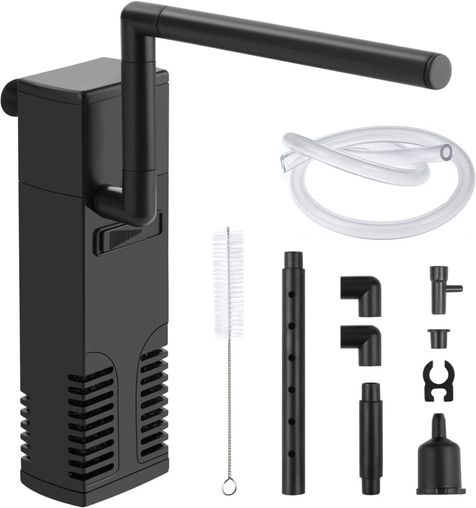 Este filtro interno para acuarios combina purificación, oxigenación y circulación del agua en un solo dispositivo compacto. Su diseño 4 en 1 permite instalarlo de varias formas según las necesidades del acuario, funcionando tanto como filtro tradicional como bomba de oxígeno conectando el tubo de aire. El caudal regulable de 300 L/H mantiene un flujo estable y adaptable, mientras que su accesorio de lluvia/cortina crea una salida de agua visualmente atractiva sin alterar el bienestar de los peces. Incluye ventosa para fijación segura y un cepillo de limpieza para mantener el rendimiento en óptimas condiciones.