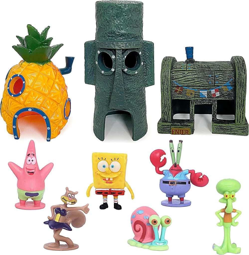 Este divertido set decorativo inspirado en Fondo de Bikini es perfecto para dar vida y personalidad a cualquier acuario. Fabricado con resina ecológica de alta calidad, no tóxica y resistente, garantiza seguridad total para tus peces sin alterar el pH del agua ni desprender color con el tiempo. Incluye la clásica casa Piña, la roca oriental y la casa de Calamardo, además de figuras de los personajes más conocidos, creando un paisaje subacuático dinámico y lleno de color. Sus bordes son suaves y aptos para peces pequeños, ofreciendo escondites, zonas de paso y espacios donde explorar sin riesgo. Gracias a su diseño estable y base firme, se mantiene perfectamente colocado en el fondo del tanque.