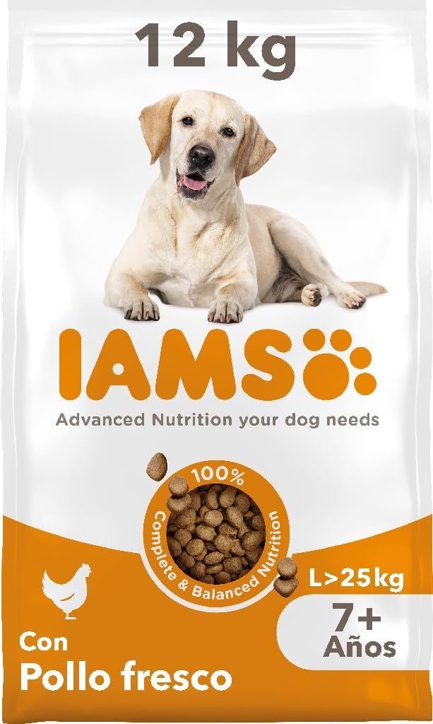 IAMS Senior con Pollo Fresco es un alimento seco 100 % completo y equilibrado para perros de raza grande senior (más de 25 kg) a partir de los 7 años. Su fórmula destaca por aportar un 78 % de proteína animal (sobre el total de proteínas), ayudando a mantener una musculatura fuerte sin sobrecargar al perro mayor. Incluye nutrientes específicos que contribuyen al cuidado de las articulaciones y al mantenimiento de un corazón sano, reforzando el músculo cardíaco.Además, su mezcla de antioxidantes con vitamina E apoya el sistema inmunitario, mientras que su sistema DentalCare ayuda a mantener los dientes limpios y reduce la acumulación de sarro.